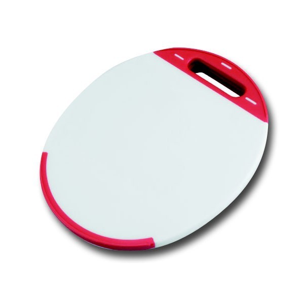 Planche à découper en polyéthylène, matière non poreuse et donc plus hygiénique, d'une forme ovale et dotée de poignées intégrées, haute qualité Lacor.